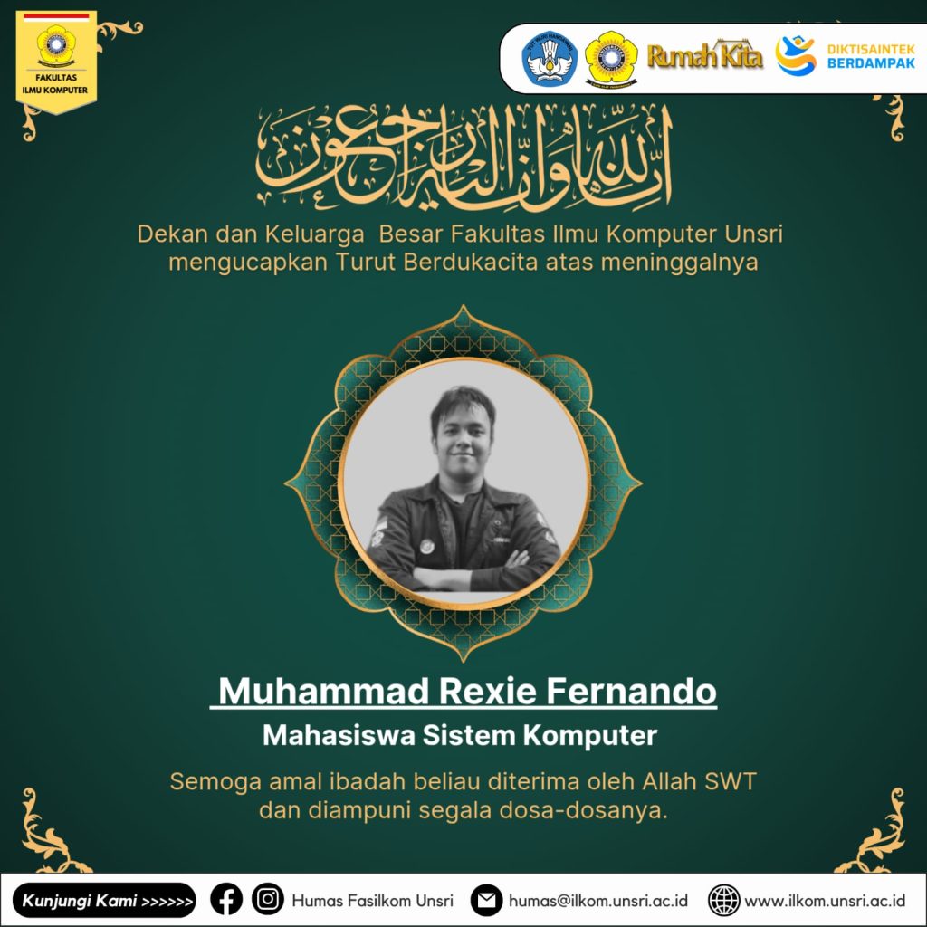 Kami segenap keluarga besar Fakultas Ilmu Komputer Universitas Sriwijaya turut berduka cita sedalam-dalamnya. Semoga amal ibadah Almarhum diterima di sisi Allah SWT dan keluarga yang ditinggalkan diberikan ketabahan serta kekuatan. Aamiin ya Rabbal ‘Alamin.