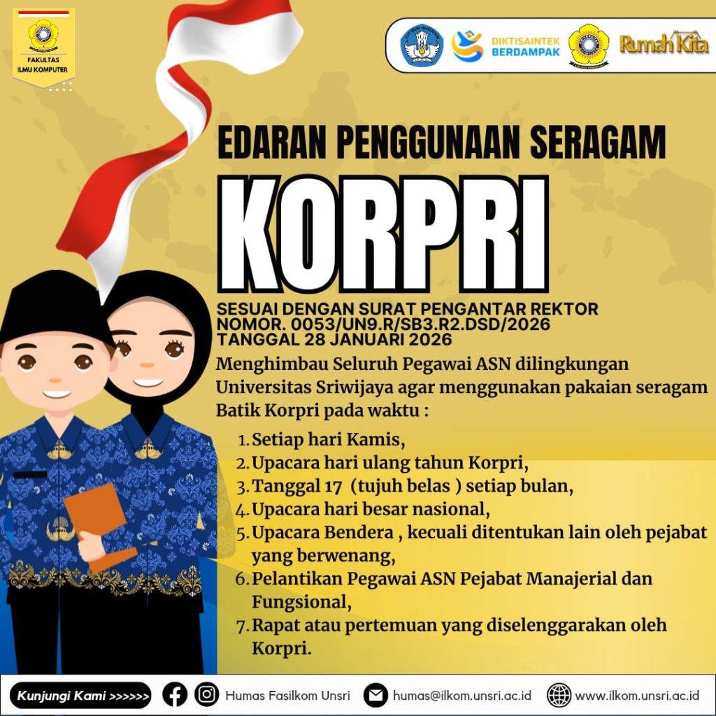 Edaran Penggunaan Seragam KORPRI dilingkungan Fakultas Ilmu Komputer Universitas Sriwijaya News & Information / Pengumuman February 4, 2026 39 views