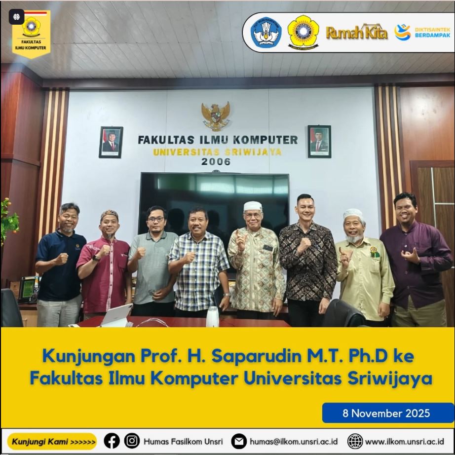 Pada hari Sabtu, tanggal 8 November 2025, Fasilkom Unsri menerima kunjungan  dari salah satu pendiri Fakultas Ilmu Komputer Universitas Sriwijaya yang merupakan sosok yang berperan penting dalam berdirinya dan perkembangan Fakultas Ilmu Komputer hingga saat ini, yakni bapak Prof. H. Saparudin M.T. Ph.D.