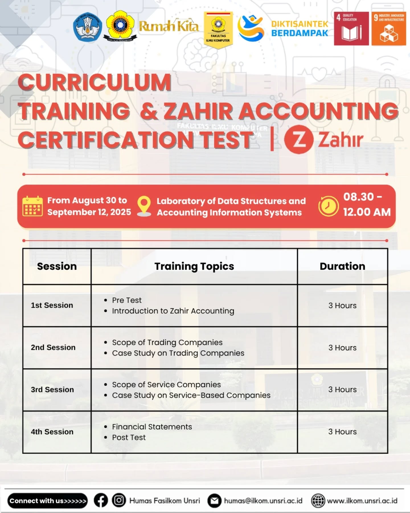 Fakultas Ilmu Komputer UNSRI mengundang mahasiswa untuk mengikuti Pelatihan dan Sertifikasi Zahir Accounting yang dirancang untuk membekali peserta dengan pemahaman aplikasi akuntansi digital yang banyak digunakan di industri.