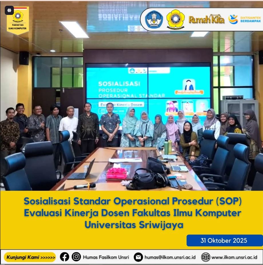 Dekan Fasilkom Unsri menugaskan Plt. Wakil Dekan Bidang Akademik, Kemahasiswaan, dan Penjaminan Mutu, seluruh ketua jurusan dan koordinator program studi serta perwakilan beberapa dosen di lingkungan Fasilkom Unsri untuk mengikuti kegiatan “Sosialisasi Standar Operasional Prosedur (SOP) Evaluasi Kinerja Dosen Fakultas Ilmu Komputer Universitas Sriwijaya” di ruang rapat lt.6 Gedung Diklat Fasilkom Unsri Palembang pada hari Jum’at, tanggal 31 Oktober 2025 pukul 13.00 s.d 17.00 WIB.