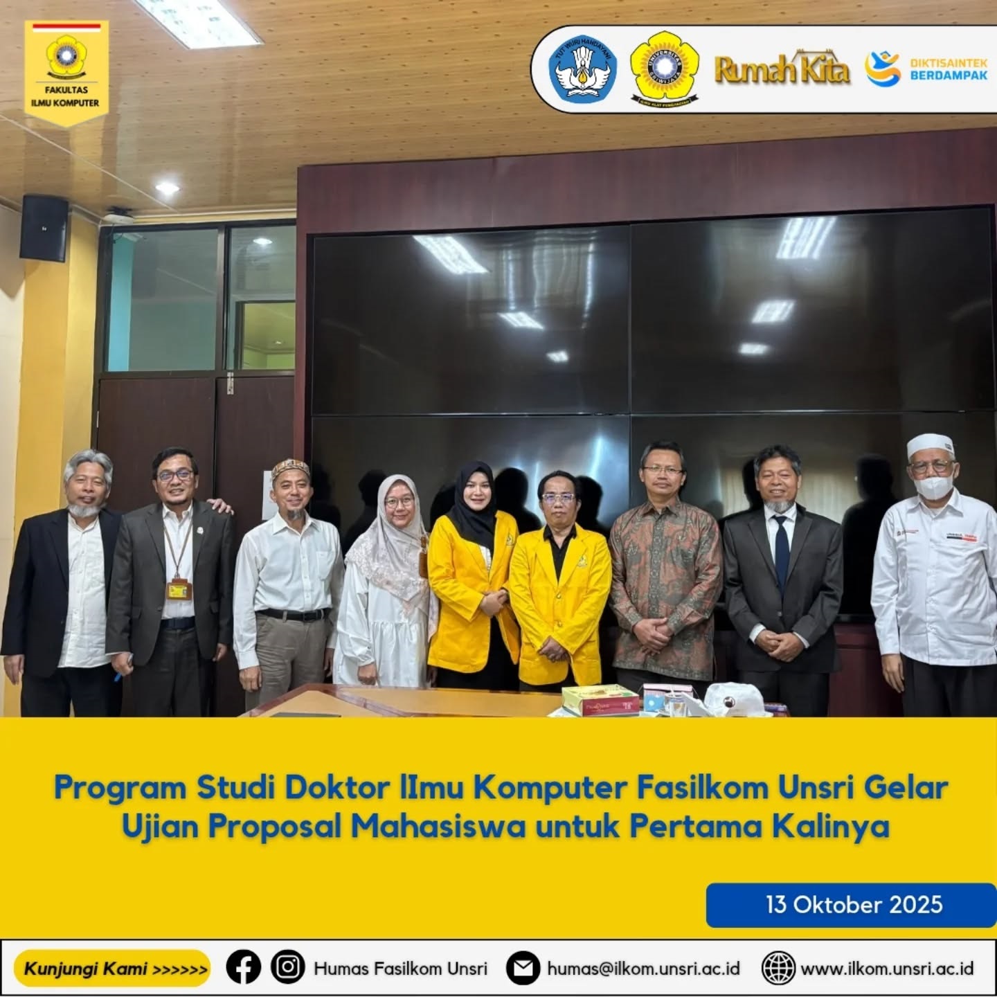 Semenjak berdirinya Program Studi Doktor Ilmu Komputer di Fakultas IImu Komputer Universitas Sriwijaya, momen bersejarah tercipta pada Senin, 13 Oktober 2025. Untuk pertama kalinya, dilaksanakan Ujian Proposal bagi dua mahasiswa, yaitu Errissya Rasywir dan Yadi Utama. Kegiatan ini berlangsung di Gedung Diklat GD6.4, Kampus Palembang, dan menjadi langkah penting dalam proses akademik Program Studi Doktor llmu Komputer.